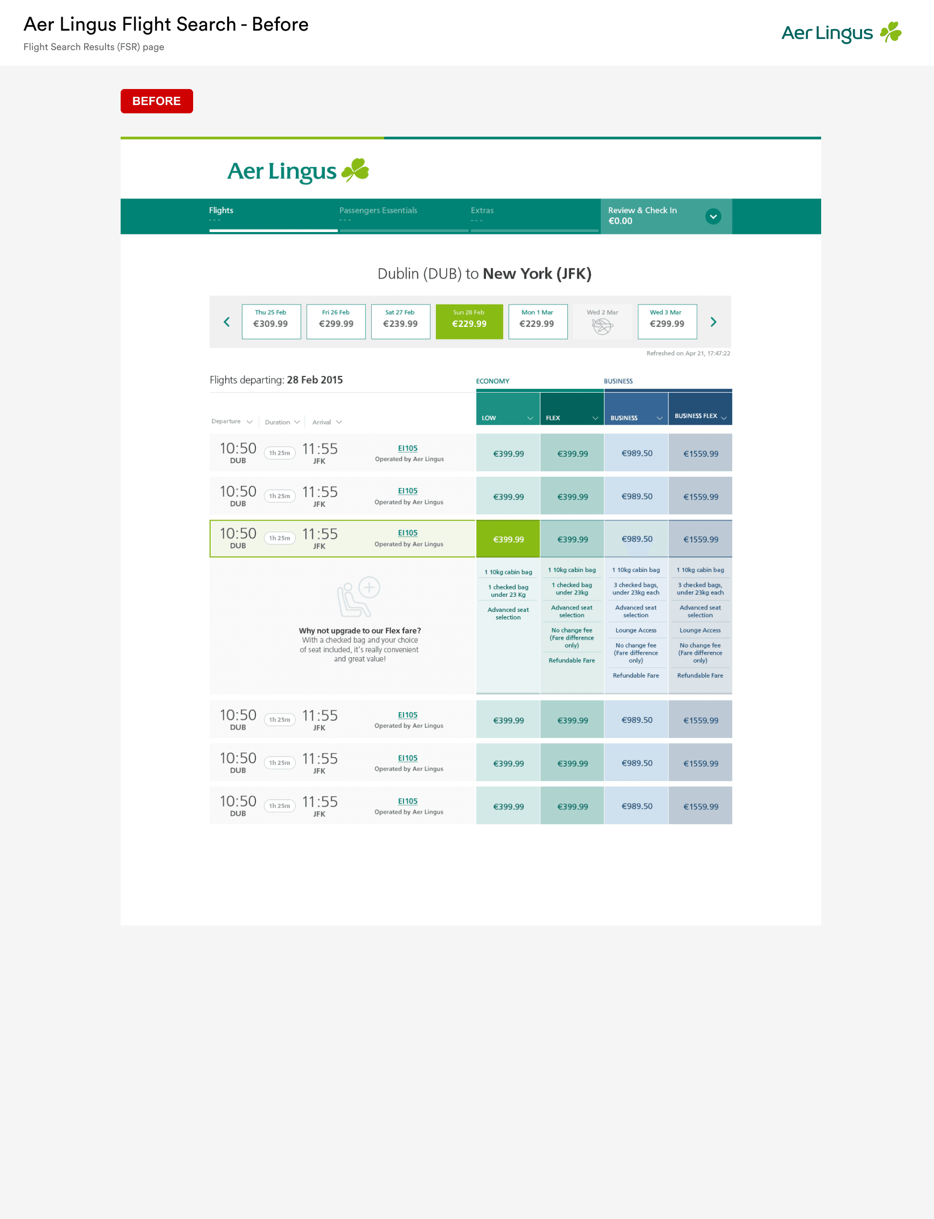 The flight search results page is a crucial component of any airline’s website, serving as the primary interface where users find and compare flight options. For Aer Lingus, the existing search results page faced several challenges: