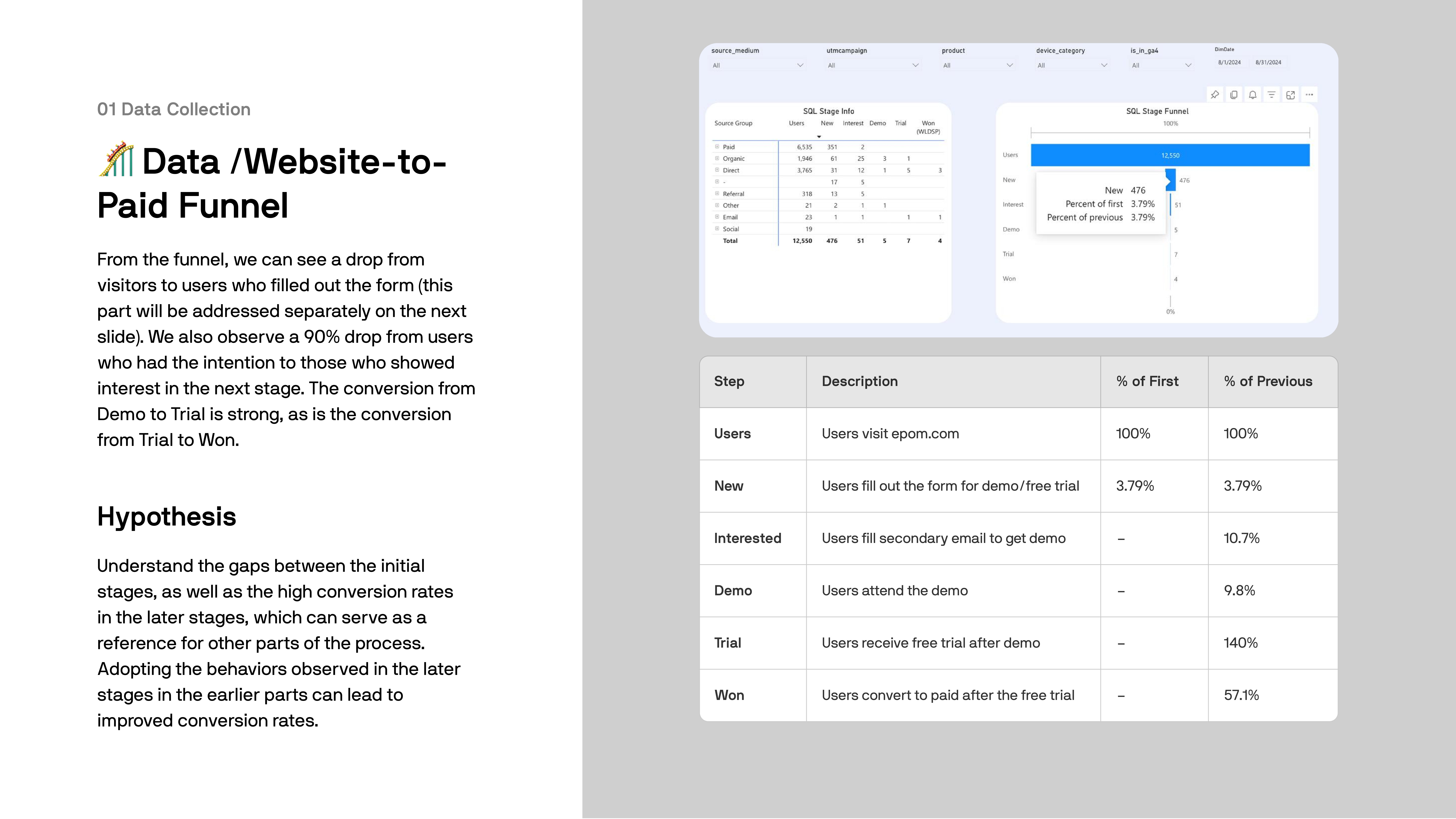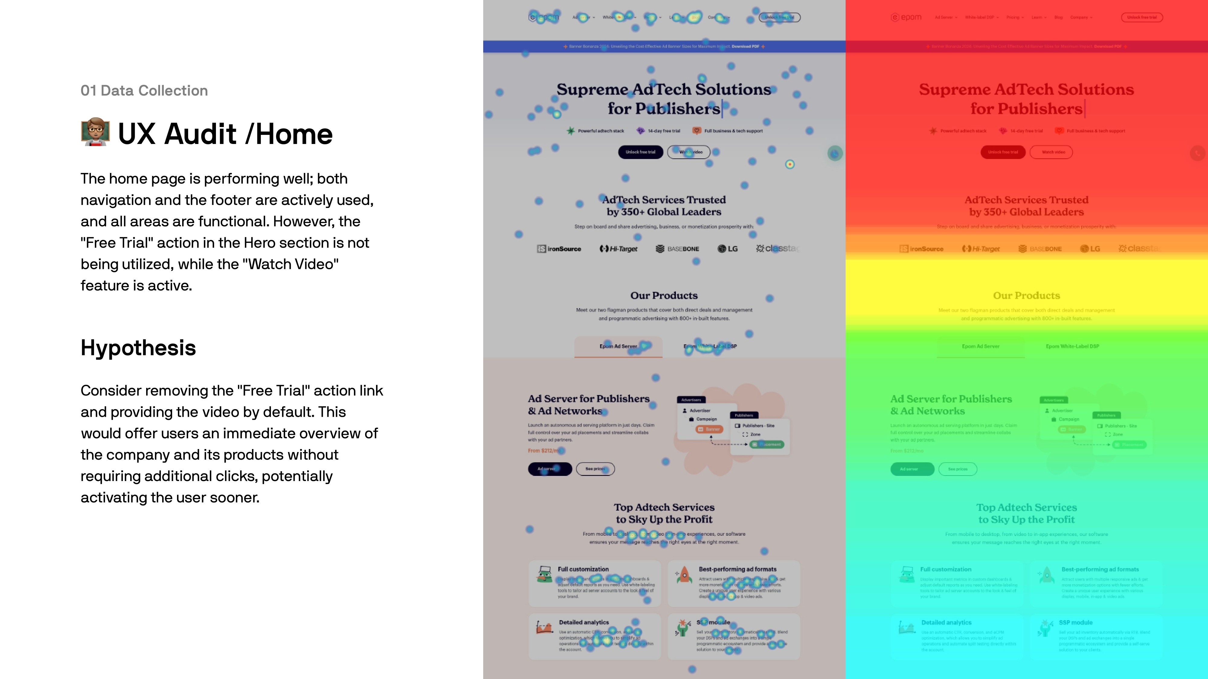 The entire user journey map was audited, and the main conversion funnels were created together with the marketing, business, and support teams. All incoming data was analyzed, highlighting potential areas for improvement. Improvement ideas were categorized based on their possible impact on the conversion funnel, and wireframe mockups were prepared. Resulted in [Data gathering is currently in progress].