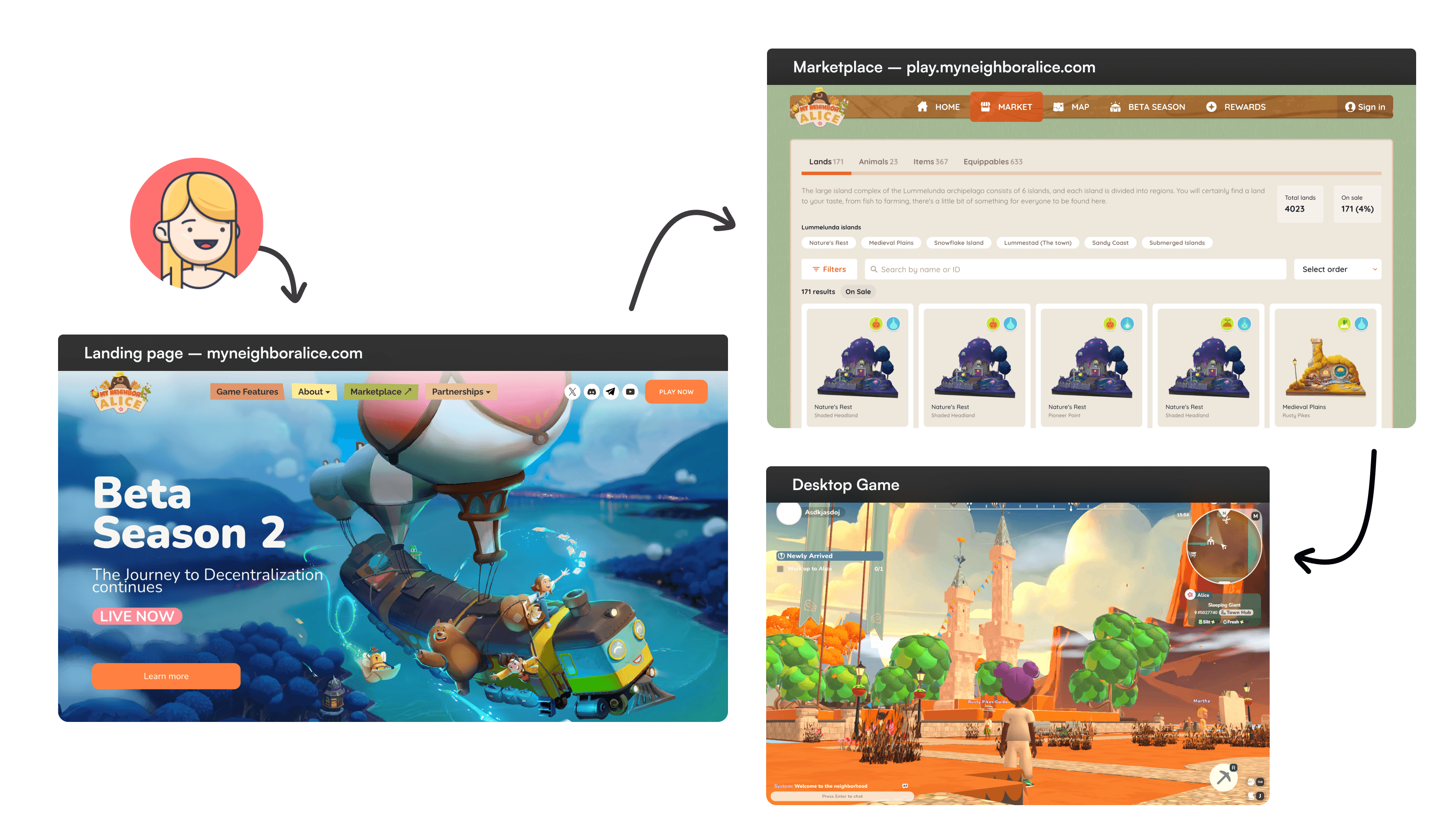 Our main hypothesis is that providing full access to an in-browser game with the same performance as on desktop, where play-to-earn is the players' primary goal, will drive growth. Reducing the number of steps and unifying different entry points is our main focus for the first phase. Instead of the three separate websites we have now, our goal is to create a single platform where users can land, play, and manage their assets. This presents not only a technological challenge but also a significant UX challenge.